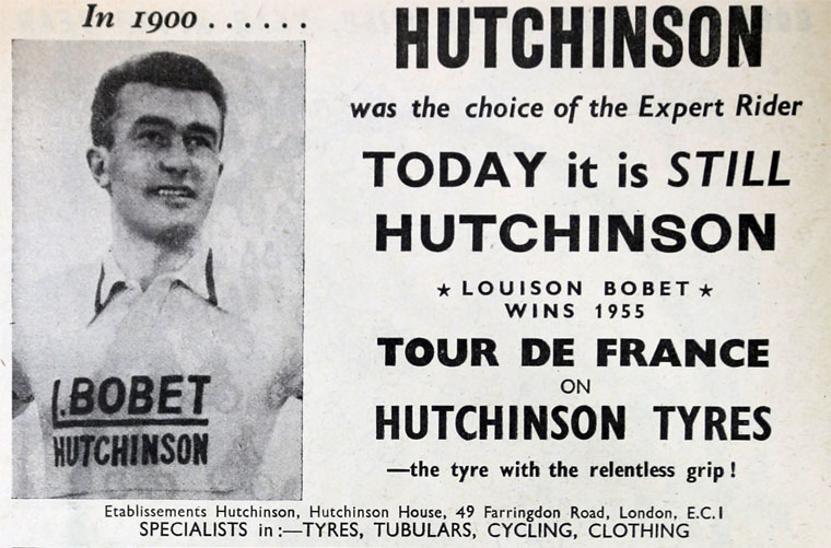 Tyres were also manufactured in France, where there was a battle for product supplier to the Tour de France. In 1955 Hutchinson tyres were the winners of La Tour with Louison Bobet He was the first great French rider of the post-war period and the first rider to win the Tour de France in three successive years.